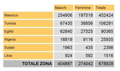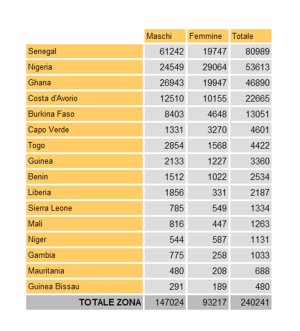 Below are some graphs taken from the Italian Institute of National Statistics (ISTAT), about the number of African registered residents in Italy in 2010 divided by gender.