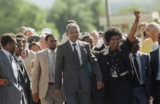 Nelson Mandela is led by his wife, Winnie Mandela, who gives a black power salute, after his release from Victor Verster prison in Cape Town, South Africa, on Sunday, Feb. 11, 1990. The leader of the African National Congress served over 27 years in jail. (AP Photo/Greg English)